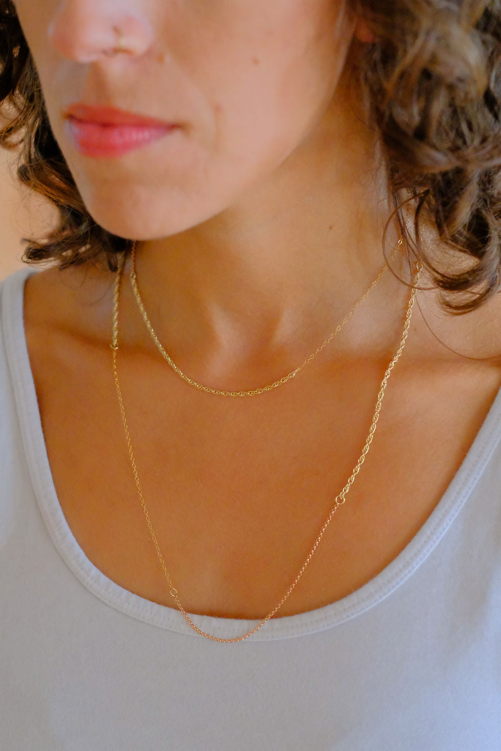 Very versatile necklace. Infinity necklace that can be wrapped, doubled or worn as one long necklace. Composed of 14k gold-filled gold link and rope chains along with rose gold.