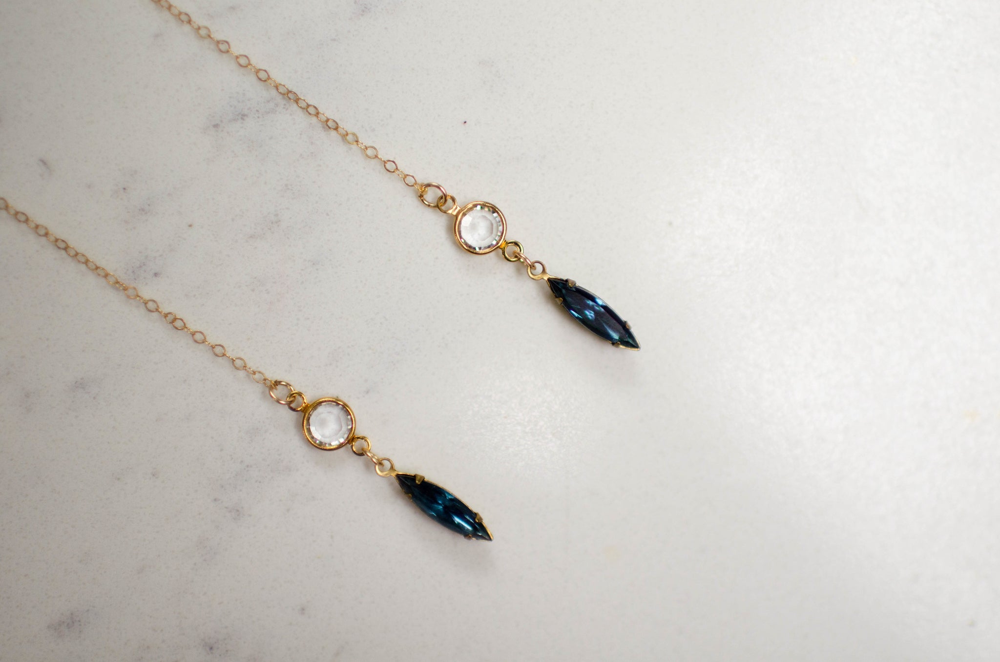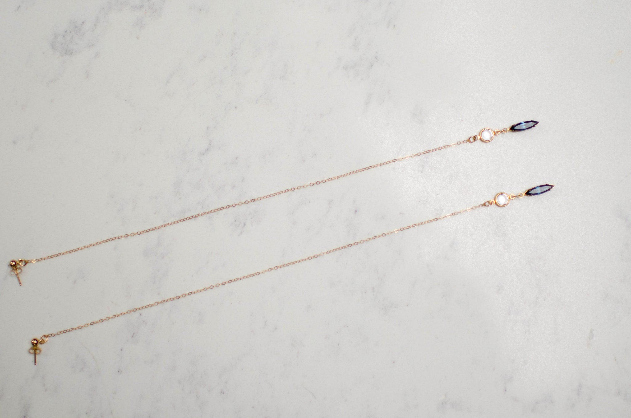 Dramatic dangle earring with 14k gold filled link chain. round glass crystal connected to navette stone dangles at the end. Attached to 14k gold filled post and back. Length is approximately 10''